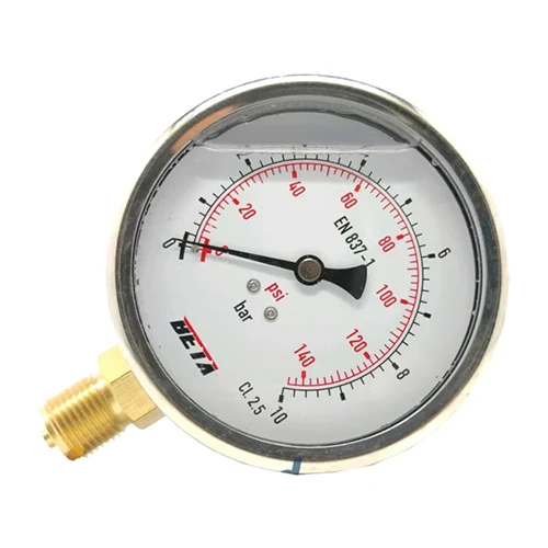 گیج فشار بتا روغنی عمودی صفحه 10 سانتی متر از جمله گیج فشار برند مطرح بتا چین و مورد استفاده در صنعت میباشد. این مدل گیج فشار از نوع روغنی بوده و دارای صفحه 100 میلی متر میباشد. همچنین جنس بدنه استنلس استیل و جنس رزوه آن از برنج تشکیل شده است. سایز رزوه 1/2 اینچ بوده و بصورت عمودی است.